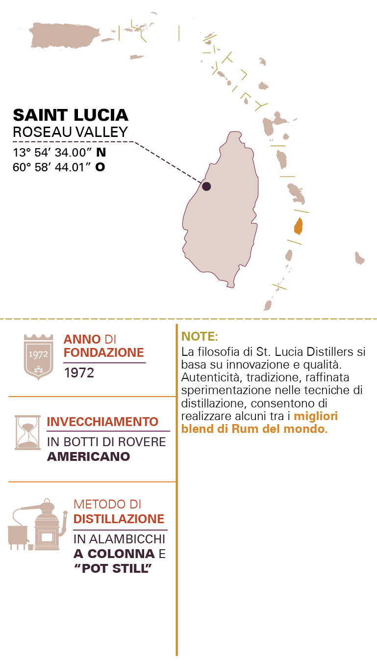 • NOTELa filosofia di St Lucia Distillers si basa su innovazione e qualità. Autenticità tradizione raffinata sperimentazione nelle tecniche di distillazione consentono di realizzare alcuni tra i migliori blend di Rum del mondo.