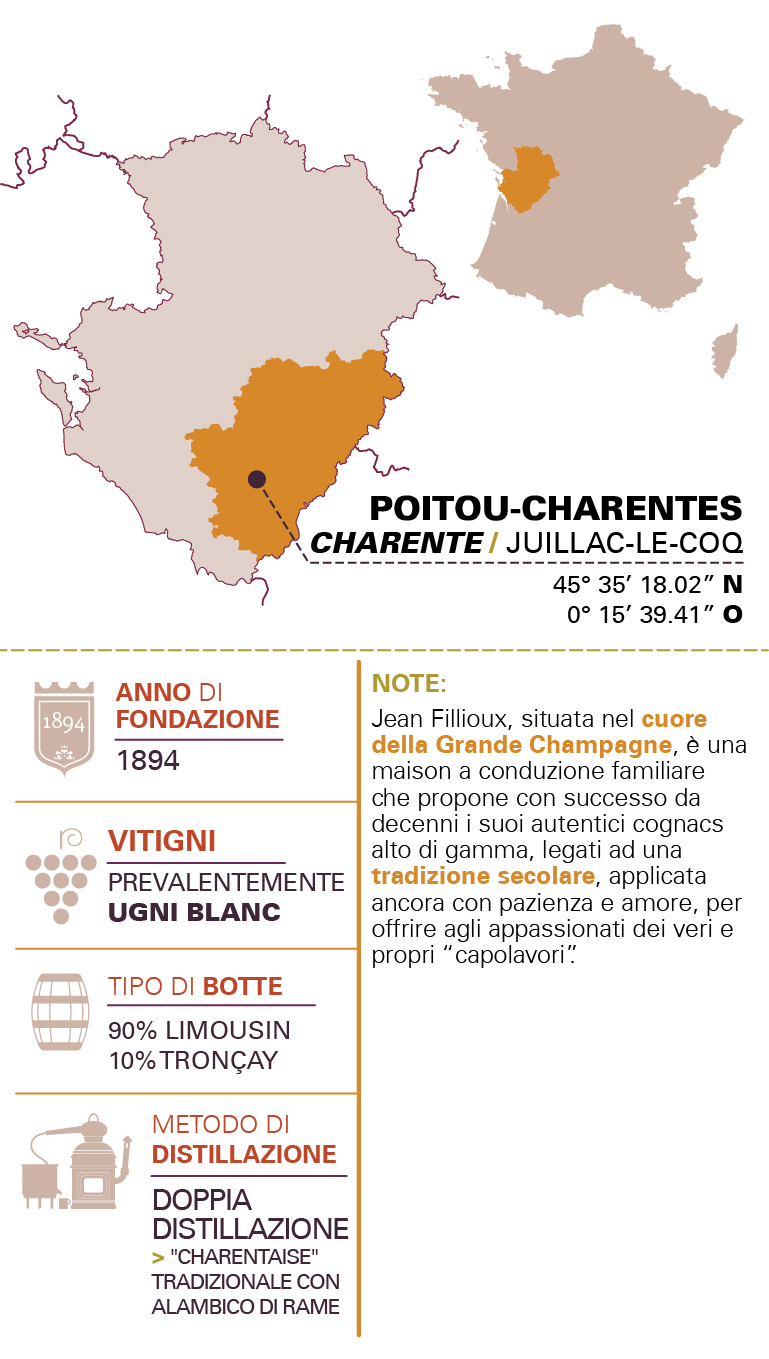 TIPOLOGIAAOC Cognac Grande Champagne ZONA PRODUTTIVAJuillac-Le-Coq MATERIA PRIMA100% Ugni Blanc DISTILLAZIONEInteramente prodotto e distillato con uva dell’annata 2008 questo Cognac Grande Champagne è un’edizione in tiratura limitata di sole 2004 bottiglie. VITIGNO100% Ugni Blanc COLOREPaglierino PROFUMOAl naso emergono note di rosa, pera matura e fico fresco SAPOREAl palato note fruttate vivaci e inebrianti prugna Mirabelle, uva moscato e un lato appetitoso di biscotti frollini. Nel finale morbido, con rimandi a mandorla e fiori d'arancio, il rovere è magnificamente integrato e fornisce la giusta dose di rotondità NOTEJean Fillioux situata nel cuore della Grande Champagne è una maison a conduzione familiare che propone con successo da decenni i suoi autentici cognacs alto di gamma, legati ad una tradizione secolare applicate ancora con pazienza e amore, per offrire agli appassionati dei veri e propri capolavori. INVECCHIAMENTO14 anni in botti di quercia francese