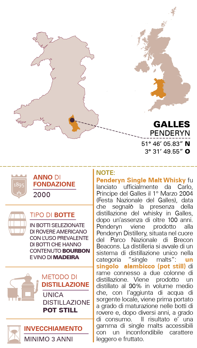 ZONA PRODUTTIVAPenderyn DISTILLAZIONESistema di distillazione unico nella categoria "single malts": un singolo alambicco di rame connesso a due colonne di distillazione. COLOREGiallo oro. PROFUMOAl naso aromi di mele e agrumi mescolati alla crema di fudge e uva sultanina che creano un whisky complesso ma fresco, pulito e ben bilanciato. SAPOREIn bocca si presenta incredibilmente dolce e armonioso, fresco e ricco con prevalenza di note di frutta essiccata. Delicato e dolce al palato, ha solo un accenno di bitter che gli dona freschezza. Sul finale il Penderyn Legend è lungo e caratterizzato da un retrogusto di torta al Madeira e uva sultanina. NOTEDistillare in Galles era un'arte perduta, almeno fino alla fine degli anni ’90, quando, in un pub di un piccolo villaggio, un gruppo di amici inizia a ipotizzare la nascita di una distilleria in Galles, la prima da oltre un secolo. Il loro sogno era di creare un Whisky puro e prezioso, proprio come l’oro gallese, rappresentato dal “filone d’oro” caratteristico del brand. Il villaggio prescelto è quello di Penderyn: qui nasce la distilleria, dove viene installato un alambicco in rame progettato da David Faraday, discendete dal famoso scienziato del 19° secolo Michael Faraday. Nel 2004 il Whisky Penderyn vede ufficialmente la luce, alla presenza del Principe del Galles Carlo. L’attenzione ai dettagli, gli investimenti, la passione e il duro lavoro sono alcuni degli ingredienti che concorrono a creare grandi distillati: nel tempo Penderyn ha continuato la sua crescita e ha guadagnato stima in tutto il mondo, vincendo numerosi premi e diventando un punto di riferimento nella produzione di Whisky Single Malt. INVECCHIAMENTOLa maturazione avviene in botti selezionate di rovere americano: nella prima fase in botti precedentemente utilizzate per il Bourbon e nella seconda fase in barriques utilizzate per la produzione di Madeira.