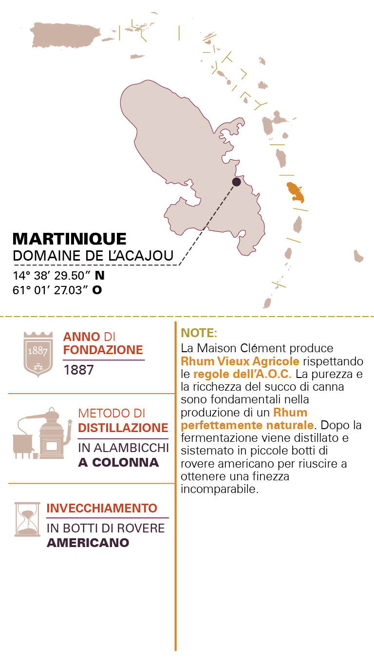 • NOTELa Maison Clément produce dal 1887 Rhum Vieux Agricole rispettando le regole dell’A.O.C. Homère Clément fu il primo ad utilizzare la purezza e la ricchezza del succo di canna che sono tutt’oggi fondamentali nella produzione di un Rhum perfettamente naturale. Dopo la fermentazione viene distillato e sistemato in piccole botti di rovere americano per riuscire a ottenere una finezza incomparabile.