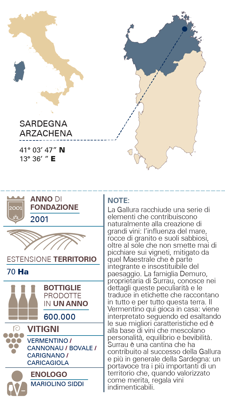 TIPOLOGIADOCG Vermentino di Gallura ZONA PRODUTTIVAGallura VITIGNO100% Vermentino TIPOLOGIA DEL TERRENODisfacimento granitico a medio impasto tendente al sabbioso VINIFICAZIONEDato il clima caldo durante la raccolta, il ciclo del freddo viene attivato immediatamente dopo la diraspa-pigiatura. Successivamente all'estrazione del mosto, la fermentazione alcolica avviene in vasche di acciaio inox a temperatura controllata intorno ai 15-18°C . La vinificazione avviene in acciaio, a temperatura controllata. Il vino viene imbottigliato poco dopo la vinificazione SISTEMA DI ALLEVAMENTOGuyot COLOREColore giallo paglierino PROFUMOAl naso emerge il suo carattere fruttato, con ricordi di agrumi e rimandi floreali uniti a una bella componente di erbe aromatiche ABBINAMENTIPerfetto per l’aperitivo e per la cucina di pesce in generale SAPOREAl palato è decisamente fresco, con una bella sapidità e una mineralità sempre in evidenza