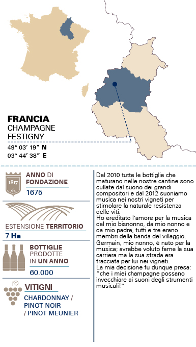 TIPOLOGIAAOC Champagne ZONA PRODUTTIVAChampagne - Vallée de la Marne VITIGNO40% Meunier, 40% Chardonnay, 20% Pinot Noir ETÀ DEI VIGNETI35 anni SISTEMA DI ALLEVAMENTOCordone Speronato COLOREDorato; perlage fine e persistente. PROFUMOAl naso si esprime con tenui sfumature fruttate. ABBINAMENTIOttimo in abbinamento ad ostriche e crostacei, si sposa bene anche con il salmone affumicato e il sushi. SAPOREAl palato si presenta vivace, pulito, con un'acidità ben bilanciata e una buona persistenza. Armonico. INVECCHIAMENTOFino a 3 anni in bottiglia
