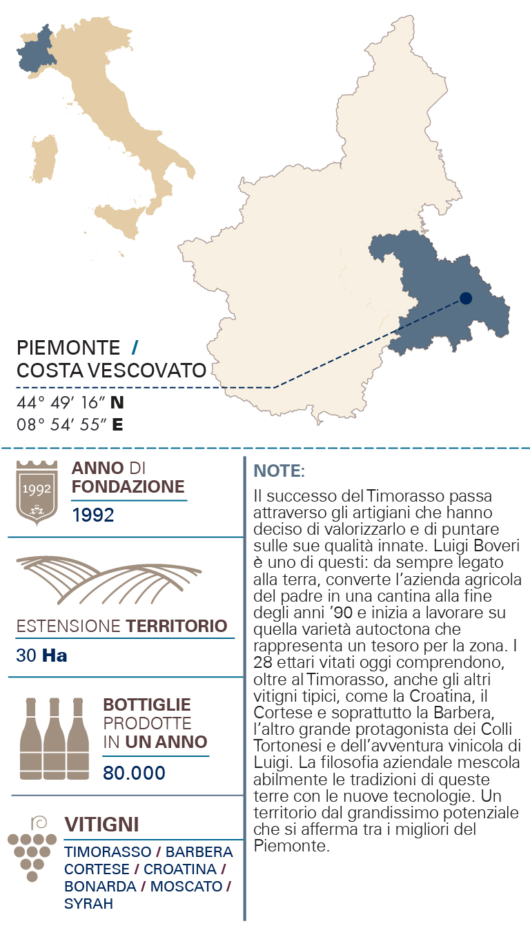 TIPOLOGIADOC Colli Tortonesi ZONA PRODUTTIVAPiemonte VITIGNO100% Cortese Terre del Prete TIPOLOGIA DEL TERRENOArgilloso calcareo ETÀ DEI VIGNETI25 anni VINIFICAZIONEPressatura soffice delle uve e fermentazione del mosto limpido a 17-18° C SISTEMA DI ALLEVAMENTOGuyot COLOREColore giallo paglierino, luminoso con riflessi verdolini PROFUMOProfumi floreali e fruttati di fiori d’acacia, biancospino pesca bianca ABBINAMENTIOttimo per l’aperitivo, si abbina anche ad antipasti di pesce, focacce e farinata SAPOREGusto e sapore fresco, piacevolmente asciutto di buona persistenza INVECCHIAMENTOBimestrale in botti di acciaio, successivo imbottigliamento, breve affinamento in bottiglia prima della vendita
